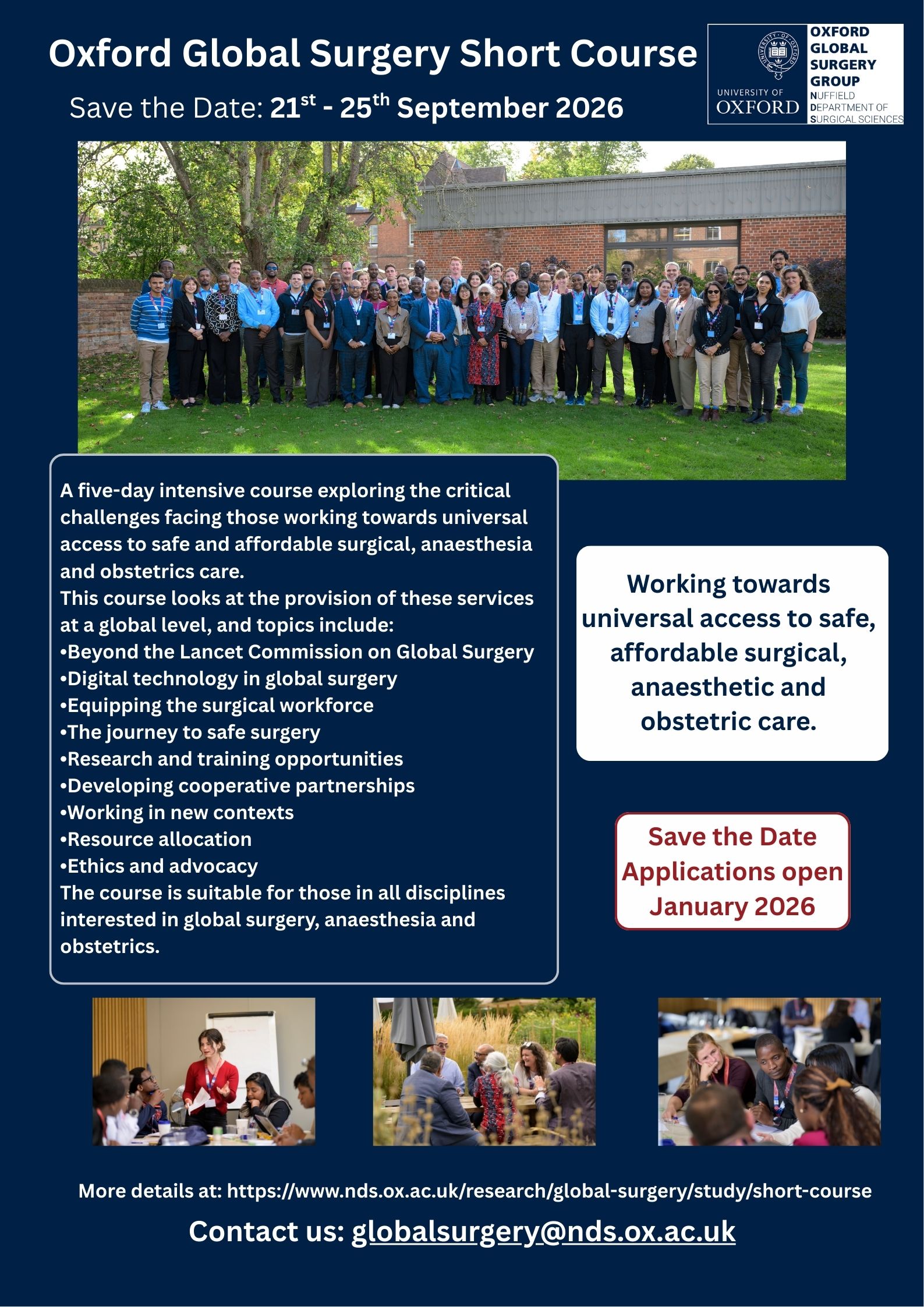 Oxford Global Surgery Short Course 2026 poster with the text 'Save the date: Applications open January 2026'